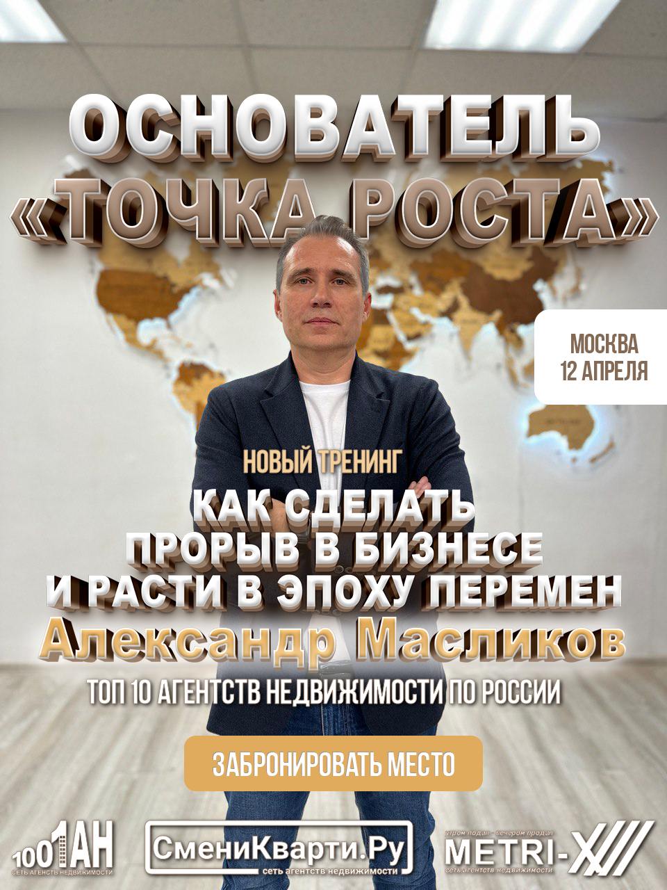 Александра Николаевича МАСЛИКОВА, имеющего за плечами многолетний опыт и множество реальных успехов в бизнесе, создателя авторских методик личностного роста, основателя и руководителя Федеральной сети Агентств Недвижимости “СмениКварти.ру”, 1001АН и “Metrix", которые ВХОДЯТ